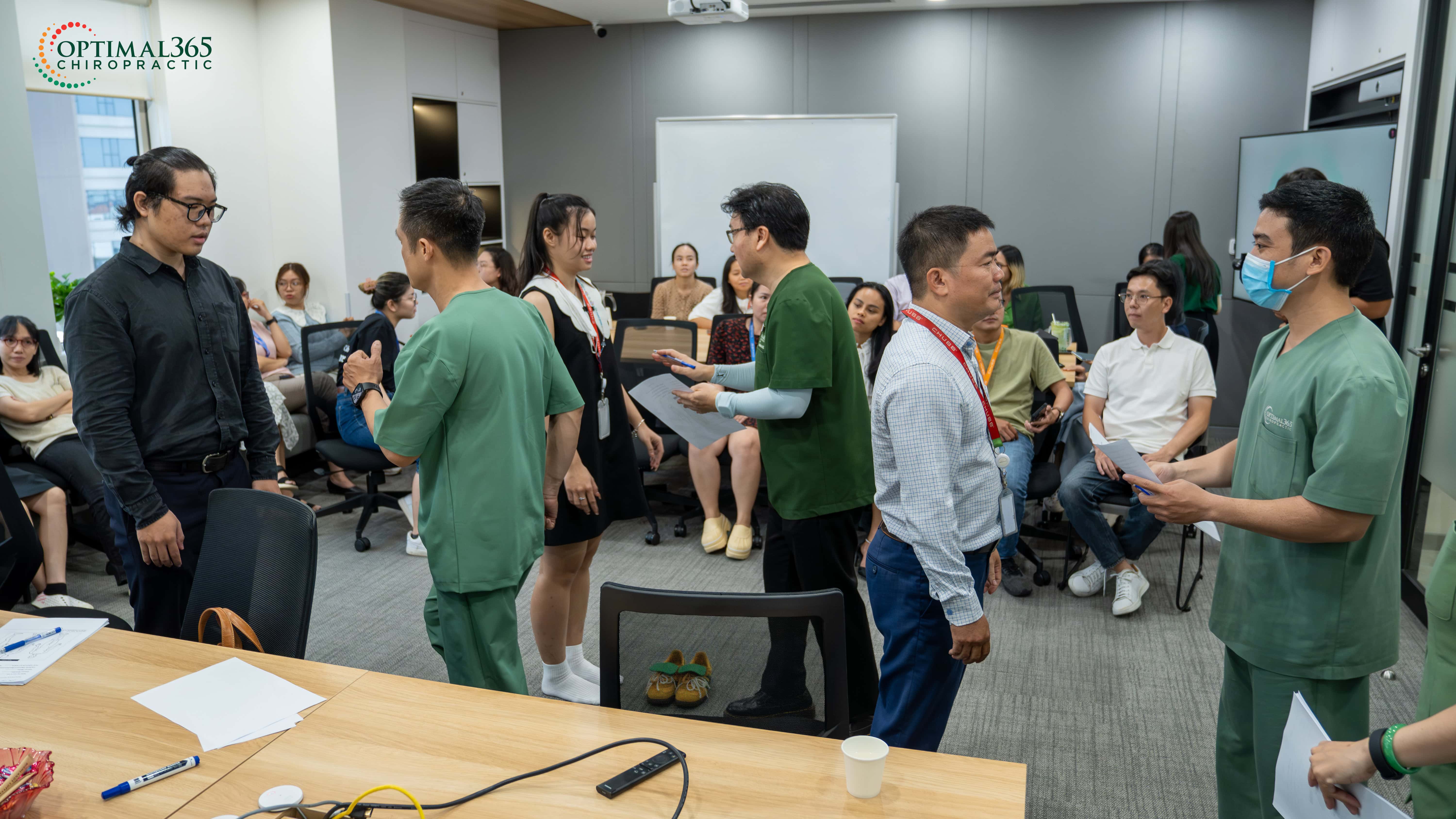 Không chỉ dừng lại ở việc cung cấp kiến thức, buổi workshop còn mang đến cơ hội thực hành thực tiễn cho các nhân viên. Đội ngũ bác sĩ và kỹ thuật viên của Optimal365 Chiropractic đã tiến hành kiểm tra biên độ vận động để phát hiện các vấn đề tiềm ẩn.